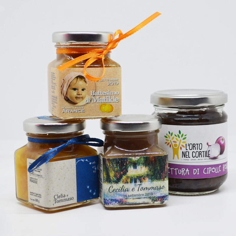 Per chi volesse piccoli pensierini, gustosi ed economici, sono disponibili confetture di frutta o verdura da 100g (gusti misti con disponibilità variabile) che per ordini minimi di 25 pezzi possono essere personalizzati a scelta!